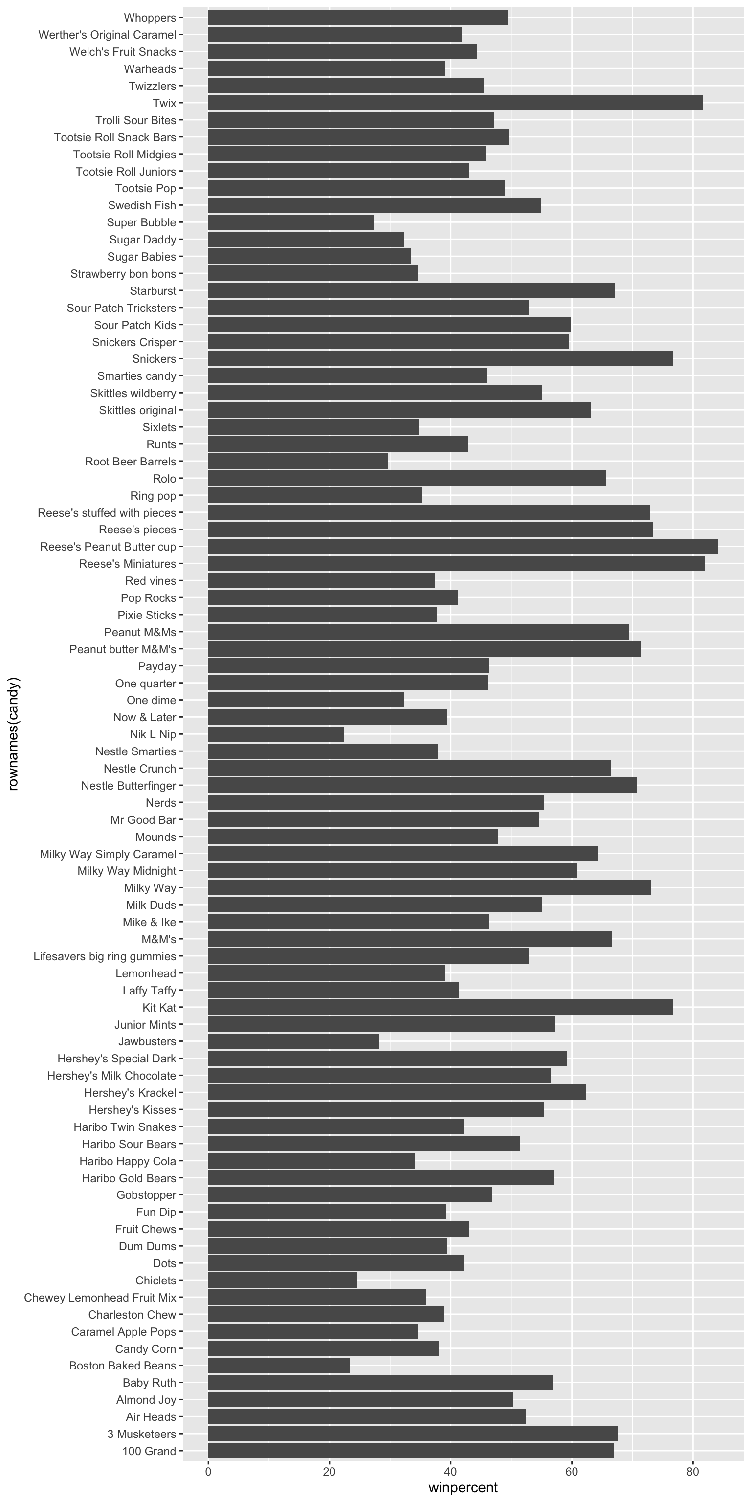 least <- candy[order(candy$winpercent), ]head(least, 5)