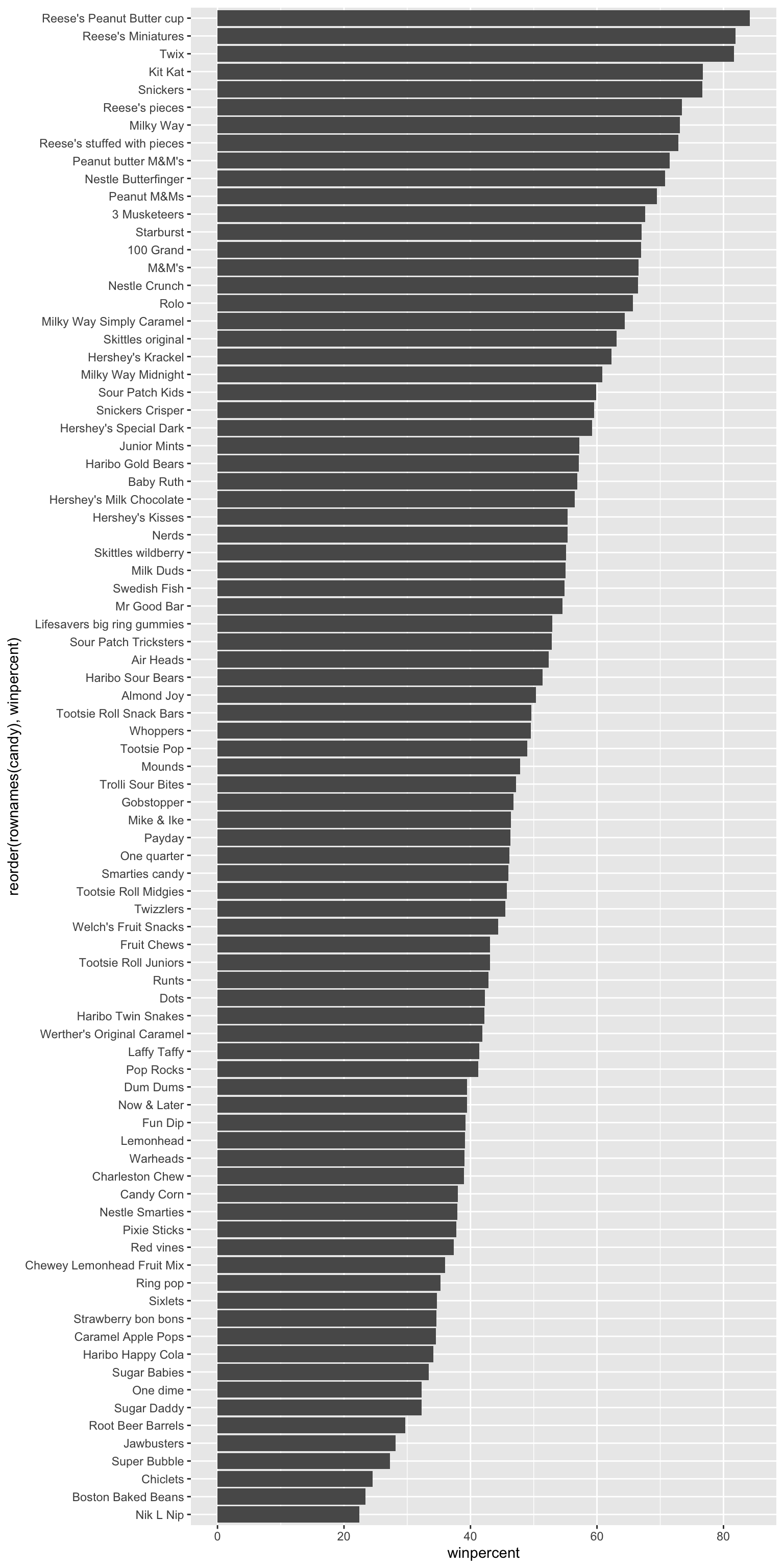 top <- candy[order(candy$winpercent, decreasing=TRUE), ]head(top, 5)