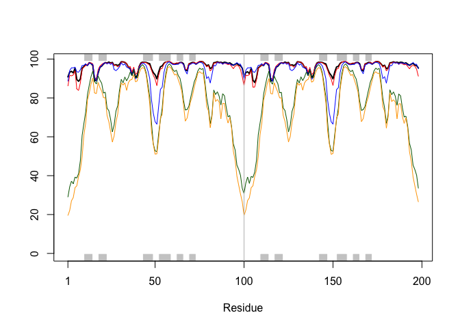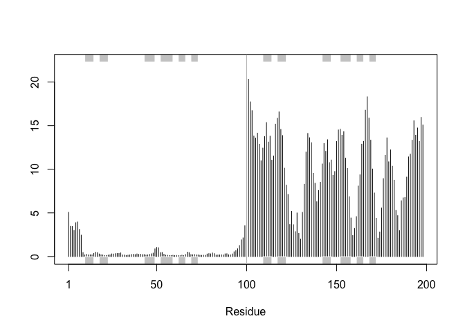 Warning in plotb3(sim[1:99], sse = trim.pdb(pdb, chain = "A"), ylab =